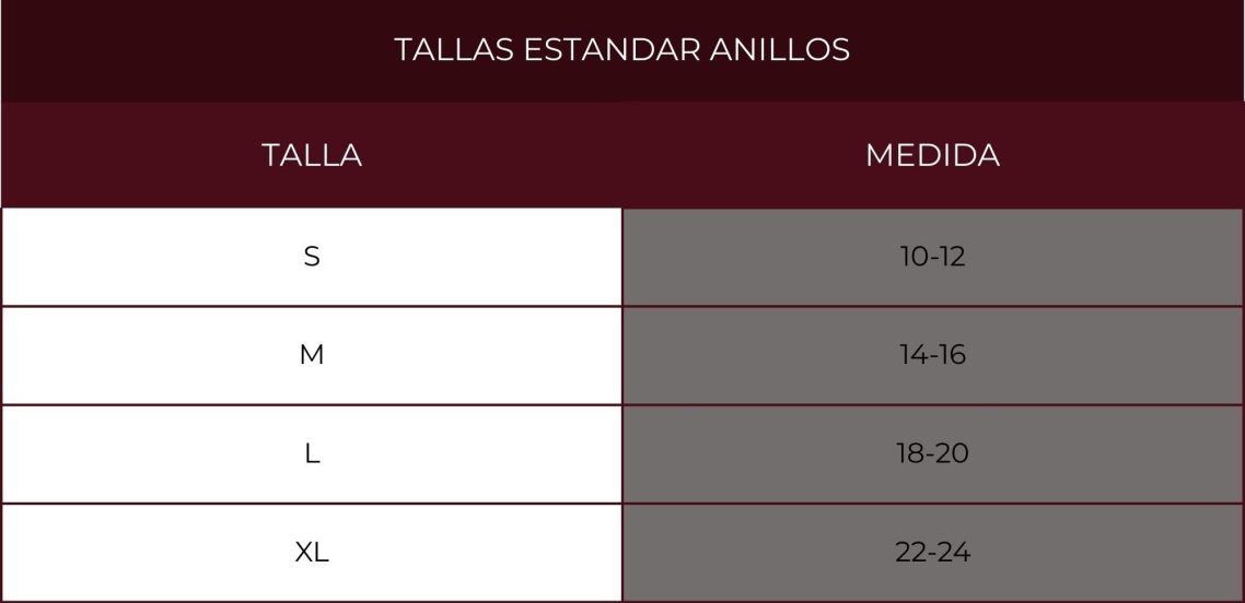Si tu medida se encuentra justo entre dos tallas, te recomendamos elegir siempre la más grande. Es preferible que el anillo tenga un ligero margen de movimiento a que resulte incómodo o difícil de quitar, especialmente en días calurosos cuando los dedos suelen inflamarse un poco.